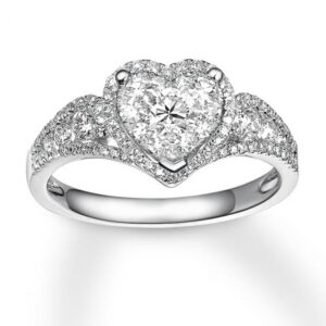 A gorgeous symbol of your love, this sparkling bridal; features an engagement ring with a romantic heart-shaped diamond haloed by glimmering round diamonds. The band and matching wedding ring are adorned with twists of round diamonds, bringing the total weight of the set to 7/8 carat. The ring is styled in 14K white gold.