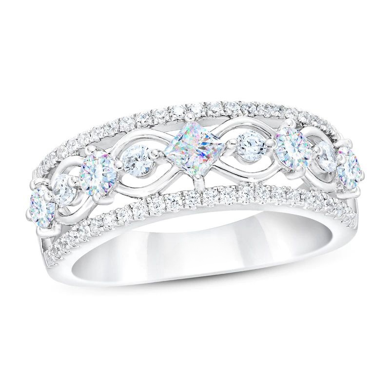 This breathtaking anniversary ring features a distinctive row of independently-certified princess-cut and round-cut diamonds, each showcasing microscopic nano-prisms for a burst of brilliant color and sparkle. Brilliant round-cut diamonds sparkle above and below, giving the ring a total diamond weight of 1 carat. The ring is crafted in iconic 14K white gold.