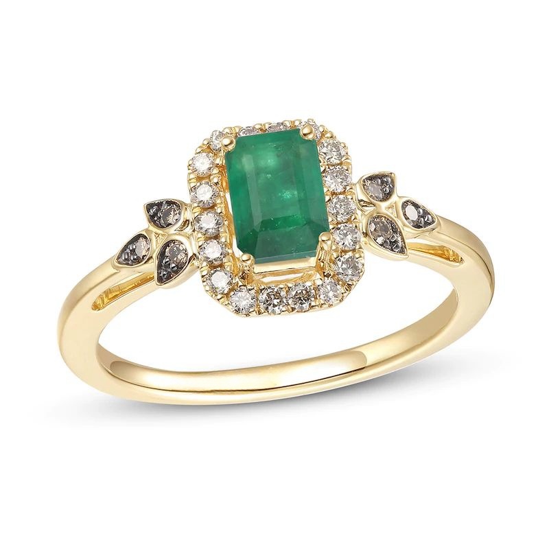 Please note: This ring is available in limited sizes. If you don’t see your size here, please visit a store to order your ring. This bold ring features a striking Emerald? surrounded by a halo of Nude Diamonds? that twinkle. Chocolate Diamonds? flank the center on top of the 14K Honey Gold? band to give the ring a total diamond weight of 1/5 carat.Discover the Legend.
